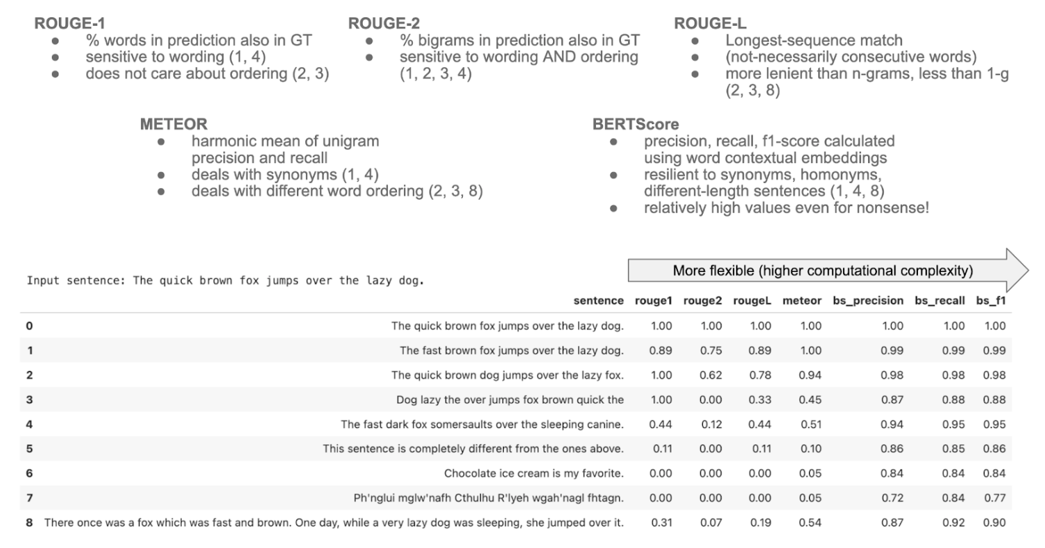 - Finally, BERTScore generates embeddings of ground truth input and model output tokens and computes a similarity score between them. This makes it the most resilient to different phrasings from this list. However, it would still tend to be forgiving of summaries that are wrong but have a large lexical overlap.