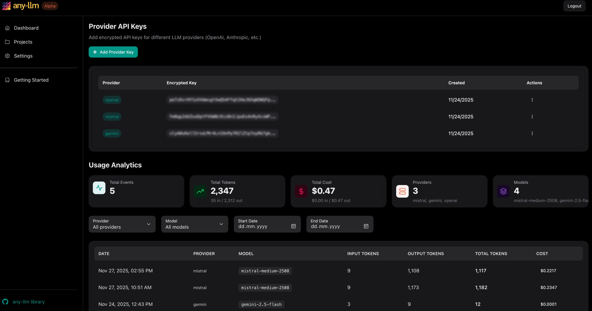 any-llm managed platform adds end-to-end encrypted API key storage and usage tracking to the any-llm ecosystem. Keys are encrypted client-side, never visible to us, while you monitor token usage, costs, and budgets in one place. Supports OpenAI, Anthropic, Google, and more.